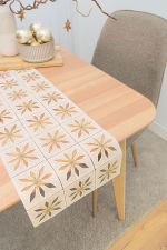 Diese Tischdeko von Plauener Spitze® besteht aus einem robusten, griffigen Strukturgewebe, welches sich aus einzelnen quadratischen Feldern zusammensetzt. Diese lassen jeweils dieselbe Sternenform erkennen, die in moderner Art mit Cut-Outs gestaltet ist, außerdem mit einem glitzernden Stern in der Mitte und feinen Glitzerfäden als Sternenstrahlen verziert ist. Die gleichmäßige Anordnung sowie die glanzvoll und festlich gestalteten Sternenformen verleihen diesem Modell einen unverwechselbaren Charme. Da durch die Cut-Outs die Tischoberfläche oder eine darunterliegende Tischdecke sichtbar wird, lassen sich damit ausgesprochen kontrastreiche und geschmackvolle Arrangements kreieren. Dieses Modell lässt sich als Tischdecke, Tischläufer, kleines Deckchen und Tischband umsetzen.
