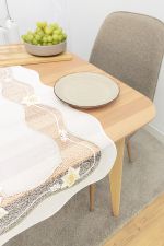 Dieses Modell von Plauener Spitze® lässt sich als Oster Tischdecke, Deckchen und Tischläufer wunderbar für den Frühling und die Osterzeit verwenden. Der wellenartig geschwungene äußere Abschluss ist charakteristisch und verleiht diesem Modell ein leichtes und verspieltes Design. Das durchsichtige, feine gitterartige Gewebe wird durch eine farbige, ebenfalls wellenförmige Umrandung abgetrennt, welche den Rahmen für ein feines Fadengeflecht bildet. Die Umrandung wird innen wiederum von einer feinen Linie nachgezeichnet, in deren Verlauf Osterglocken und feine Gänseblümchen angeordnet sind. Außen am farbigen Rahmen ist der Schriftzug Plauener Spitze® aufgestickt. Durch das harmonische Design und die soften, angenehmen Farben lässt sich dieses Design wunderbar in die pastellige Deko der Frühlings- und Osterzeit integrieren.