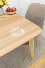 Dieses Modell von Plauener Spitze® lässt sich als Tischdecke, Tischläufer, Deckchen und Tischband umsetzen. In der runden Form treffen verschiedene geometrische und von der Natur inspirierte Elemente aufeinander. Im groben Maschengeflecht der äußeren Umrandung sind somit abstrakte Blätterformen zu erkennen, außerdem geschwungene, an Blüten und Gräser erinnernde Gebilde, die für ein wohnliches, lebendiges Flair sorgen. Als Abgrenzung zum inneren Bereich ist ein gemustertes Band eingefügt, entlang dessen sind große rautenartige Formen angeordnet, die ebenfalls verschiedene Muster zeigen und dadurch nochmal mehr Abwechslung in das luftige, lockere Maschendesign bringen.